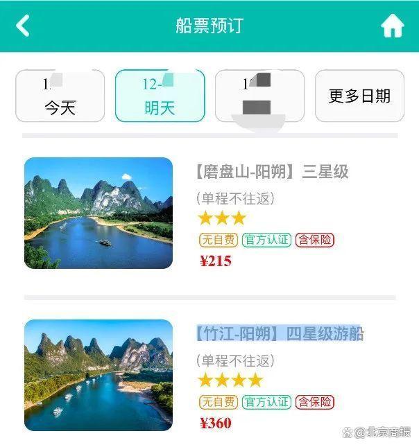 進(jìn)一步來看,漓江風(fēng)景區(qū)船票購買界面提供的215元的“【磨盤山-陽朔】三星級”和360元的“【竹江-陽朔】四星級游船”選項中,雖然顯示“含保險”,但并未說明保費與承保的保險公司,乃至保障責(zé)任等信息。