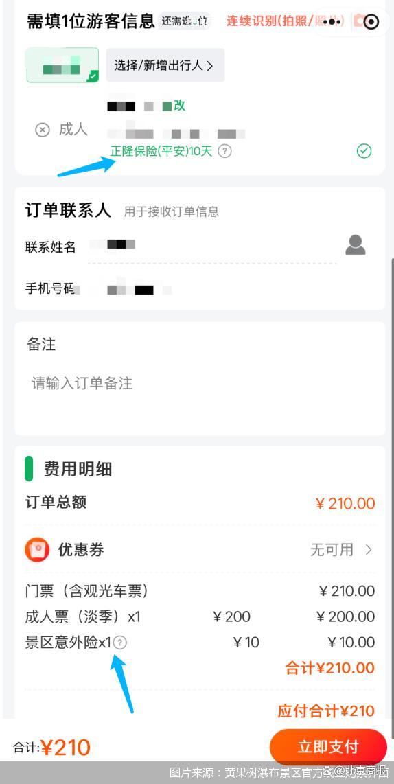 比如,游客在黃果樹瀑布景區(qū)官方線上渠道購票時,在提交訂單界面,會捆綁有一份“景區(qū)意外險”,顯示為10元。當(dāng)記者填寫完身份信息后,在身份信息旁會出現(xiàn)“正隆保險(平安)10天”字樣,并且進(jìn)行了默認(rèn)勾選,如果不需要購買保險,則需要取消該選項的勾選。
