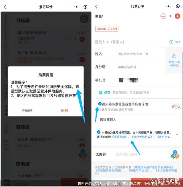 廣西德天大瀑布景區(qū)的官方線上購票渠道在選擇“日場票”(成人票)后,會提示“為了提升您在景區(qū)的游玩安全保障,該票型默認(rèn)選取景區(qū)意外保險服務(wù)”。進(jìn)一步來看,該景區(qū)默認(rèn)勾選的保險為“德天瀑布景區(qū)旅游意外傷害保險”,并在保險名稱下方標(biāo)有“本模塊為保險投保界面,由中元經(jīng)紀(jì)所有、管理并運營”。