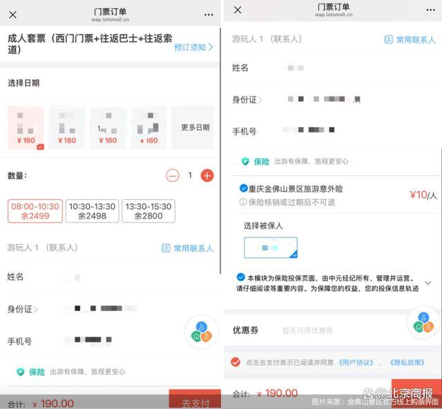 此外,出現(xiàn)“由中元經(jīng)紀(jì)所有、管理并運營”相關(guān)描述的還有重慶金佛山景區(qū)。在金佛山景區(qū)微信公眾號官方購票渠道中,點擊成人套票(西門門票+往返巴士+往返索道)這一選項后,顯示價格為180元。在提交訂單時,會默認(rèn)勾選有“重慶金佛山景區(qū)旅游意外險”,價格為10元。該選項旁標(biāo)有:“本模塊為保險投保頁面,由中元經(jīng)紀(jì)所有、管理并運營請仔細(xì)閱讀等重要內(nèi)容。”
