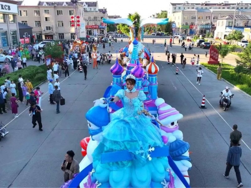 巡游隊伍中,47名專業(yè)演員的表演同樣精彩紛呈。“金翎飛霄”方陣的男演員們身著女真武士鎧甲,手持長矛跳起剛勁有力的戰(zhàn)舞;“鐘林毓秀”方陣的女演員則化身森林精靈,輕盈的舞步配合著花車上搖曳的藍(lán)莓枝椏,演繹出林間仙境的唯美畫面。演員們還不時走下花車與觀眾互動,教小朋友模仿鄂倫春族的傳統(tǒng)舞蹈動作,現(xiàn)場笑聲不斷。