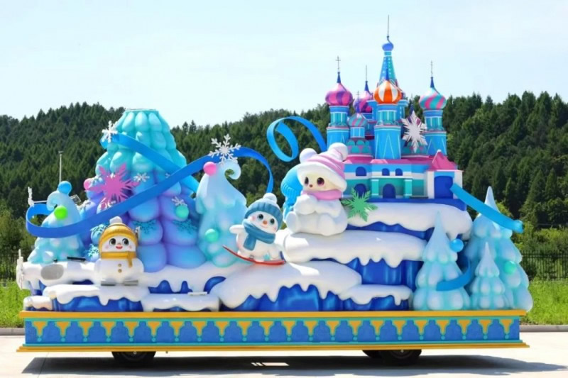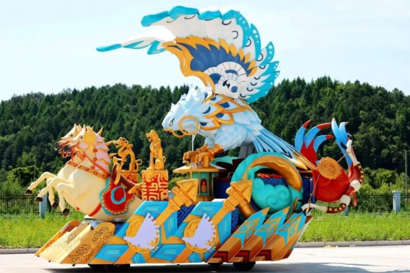 花車設(shè)計不僅注重視覺沖擊力,更融入動態(tài)特效:虎頭擺動、翅膀扇動、雪花機(jī)噴灑等細(xì)節(jié),讓靜態(tài)的造型煥發(fā)生命力。夜幕降臨時,花車更以夜光效果點亮林海,為觀眾呈現(xiàn)一場光影交織的奇幻盛宴。