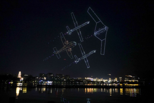 這是7月11日晚在重慶市梁平區(qū)雙桂湖國家濕地公園拍攝的無人機(jī)表演。新華社記者 黃偉 攝