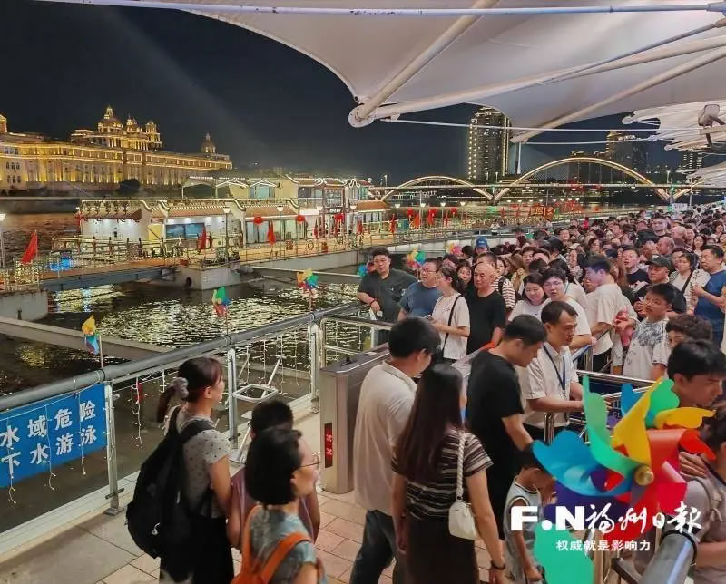 國(guó)慶中秋假期,閩江夜游游客流量大增,等待上船的游客排起長(zhǎng)隊(duì)。(八方客運(yùn)公司供圖)