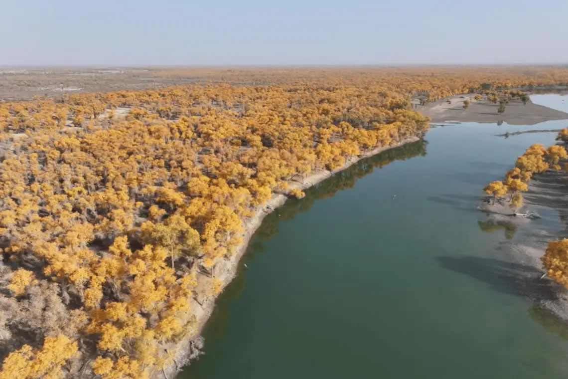 金黃的胡楊與碧綠的水面構(gòu)成一幅壯闊的秋日美景 (王隴江 攝)