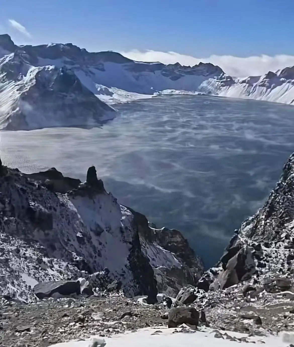 長白山景區(qū)的一位導(dǎo)游晚晚(化名)當(dāng)天也目睹了“海浩”的奇觀。10月20日上午9點(diǎn)左右,她跟隨景區(qū)工作人員前往天池附近清理道路積雪,來到北坡一觀景臺處時(shí),看到在大風(fēng)吹拂下,凝結(jié)的水蒸氣正貼著天池的水面擴(kuò)散、飄動(dòng)。