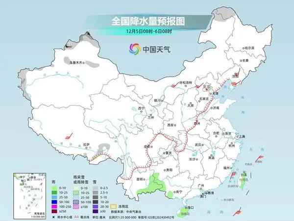 明天,內(nèi)蒙古東北部、黑龍江西北部、新疆北疆北部和南疆西部山區(qū)、西藏東南部等地部分地區(qū)有小到中雪或雨夾雪。其中,新疆北疆北部局地有大雪或暴雪;貴州西南部、云南東部、廣西西部、海南島大部、臺灣島東部等地部分地區(qū)有小雨。