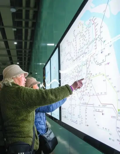 18號線二期工程開通初期運營。一早,市民在康文路站內(nèi)了解上海軌交最新運營網(wǎng)線圖。記者 孟雨涵 攝
