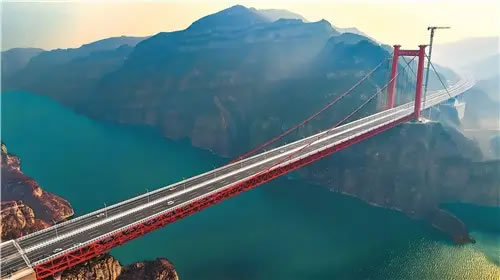 蜿蜒如龍的濟(jì)新高速,長(zhǎng)度約48公里,點(diǎn)睛之筆就是這座黃河三峽大橋。長(zhǎng)1688.5米、主跨度555米,這座“咽喉工程”不僅是我省跨徑最大的橋梁,也在世界工程史上留下河南地標(biāo)。