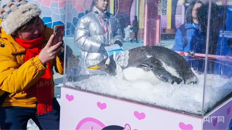 游客與企鵝互動(dòng)打卡(央廣網(wǎng)發(fā) 大連圣亞海洋世界供圖)