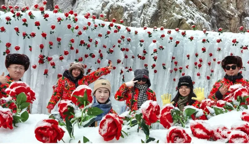 冰封的玫瑰、融入巖畫元素的雪雕、百米長的雪圈滑道,將景區(qū)打造成夢幻的冰雪秘境。身著多彩冬裝的游客們穿梭其間,或駐足觀賞或拍照打卡,不時發(fā)出陣陣贊嘆。“巖畫和冰雪結(jié)合,就像穿越到了冰河時代!”來自西安的游客李女士,一邊拍攝冰封玫瑰,一邊向同伴分享自己的感受。