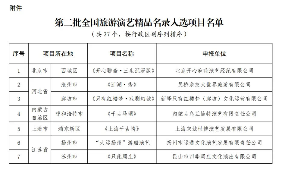 央廣網(wǎng)北京1月16日消息(記者 宋雪)文化和旅游部辦公廳近日發(fā)布通知,公布第二批全國(guó)旅游演藝精品名錄入選項(xiàng)目名單,《只有紅樓夢(mèng)·戲劇幻城》《赳赳大秦》《樂(lè)動(dòng)敦煌》等27個(gè)項(xiàng)目入選。