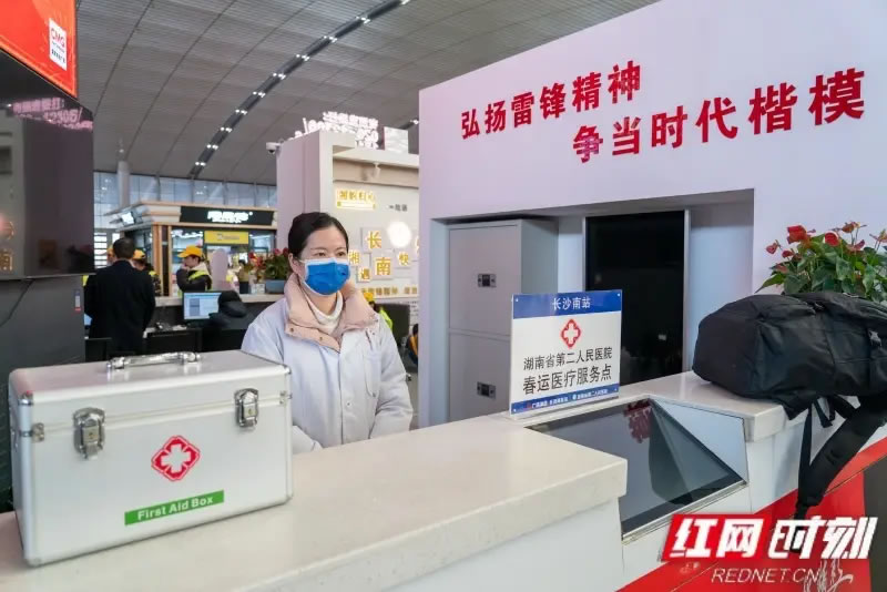 為保障春運(yùn)期間旅客健康出行,湖南多個(gè)車站升級了醫(yī)療服務(wù)措施。長沙南站聯(lián)合湖南省第二人民醫(yī)院,在“湘遇長南雷鋒服務(wù)站”設(shè)立了便民醫(yī)療點(diǎn),配有醫(yī)護(hù)人員駐守,提供免費(fèi)的健康咨詢、醫(yī)療救護(hù)以及基礎(chǔ)應(yīng)急藥品與設(shè)備。