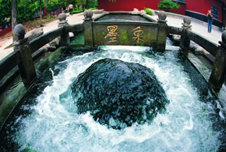 為濟南七十二名泉之一。位于百脈泉公園龍泉寺西南側(cè),泉池呈方形,漢白玉雕砌,正常年流量0.3立米/秒。泉孔黝深,水色蒼蒼如墨而得名。泉眼直徑0.4米,泉水騰涌而出,水清透明,泉水黝深,故名“墨泉”。墨泉水出自深部奧陶紀石灰?guī)r巖溶裂隙,盛水期泉流量0.5立方/秒,水柱沖出泉口,聲如雷鳴,雪濤飛濺。注入石渠,浩浩而下,有“一泉成河”的美譽。泉池前后刻“墨泉”二字,為大書法家舒同先生題寫。字體方正渾厚,“頗具魏晉飄逸之氣,含篆籀之義理,得分隸之謹嚴”,墨泉所在位置1966年-1980年曾是章丘縣委家屬住院,時任章丘縣委書記的舒同先生居此。