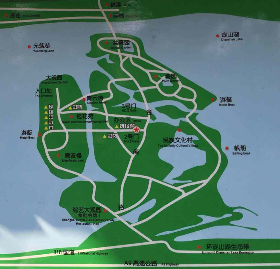 大觀園在設(shè)計(jì)上與北京大觀園明顯不同的是上海大觀園利用江南水鄉(xiāng)的特點(diǎn)在園中布置了大面積人工湖泊。以大門—體仁沐德—大觀樓為中軸,有10多組建筑,20多個(gè)景點(diǎn),建筑面積共7837平方米。設(shè)計(jì)曲徑通幽大假山作入口屏障,以挖湖取土堆掇1座高16米的小山為大觀樓的背景,構(gòu)成大觀樓背山面水的壯麗氣勢(shì)。全園以大湖為中心,以池塘、沁芳溪溝通各景點(diǎn),構(gòu)成有主有支、有動(dòng)有靜的水系,湖邊設(shè)亭、榭,湖中設(shè)曲橋、石舫、石燈,溪上設(shè)橋亭,形成山重水復(fù)、流水人家的江南園林風(fēng)光。大觀園運(yùn)用園必封、必隔,在封隔中求得氣勢(shì)流動(dòng)和內(nèi)聚中心的中國(guó)傳統(tǒng)建筑觀念,建造1個(gè)封閉、向心的內(nèi)涵豐富的小天地,增加景物層次,使建筑與環(huán)境融合為一,使《紅樓夢(mèng)》中的大觀園景觀再現(xiàn)。