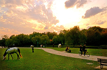 上海共青國(guó)家森林公園是以森林為主要景觀的特色公園,共種植200余種樹(shù)木,總數(shù)達(dá)30多萬(wàn)株。公園分為南北兩園,北園占地1631畝稱(chēng)為共青森林公園,南園占地239.6畝稱(chēng)為萬(wàn)竹園。南北園風(fēng)格各異,北園著重森林景色,有丘陵湖泊草地,南園則小橋流水一派南國(guó)風(fēng)光。除觀景之外,游人也可在園內(nèi)騎馬,燒烤和垂釣。