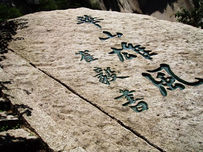 東峰頂生滿巨檜喬松,濃蔭蔽日,環(huán)境非常清幽。游人自松林間穿行,上有團才綠蔭,如傘如蓋,耳畔陣陣松濤,如吟如詠,頓覺心曠神怡,超然物外。明書畫家王履在《東峰記》中談他的體會說:高大的檜松蔭蔽峰頂,樹下石徑清爽幽靜,風(fēng)穿林間,松濤涌動更添一段音樂般的韻致,其節(jié)律,此起彼伏,好象吹彈絲竹,敲擊金石,多么美妙啊。