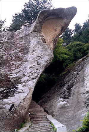 古時稱登東峰道路艱險,《三才圖會》記述說:山崗如削出的一面坡,高數(shù)十丈,上面僅鑿了幾個足窩,兩邊又無樹枝藤蔓可以攀援,登峰的人只有爬在崗石上,腳手并用才能到達峰巔。今已開辟并拓寬幾條登峰臺階路,游人可安全到達。