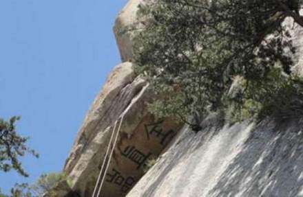 關(guān)于全真巖各類史志書籍記載頗多!度艌D會》載:“靜室旁有巖,高數(shù)十丈,遙覆其室,并書‘全真巖’三字!薄度A岳圖經(jīng)》中記述,全真巖三字每字大約七八尺高,鐫刻在那樣一個地方,除過能騰云駕霧的神仙,凡夫俗子肯定是辦不到的。明書畫大家王履的《南峰記》中記述得列為形象:巖好像一個彎腰人的頭部,遠遠遮蓋住腹部的石室。倒坎巖頂端鐫“全真巖”三字,并涂以紅色。世上沒有神仙,刻字肯定是人類所為,但在這樣特殊的位置,上不可上,下不可下,除非懸浮于空中才能可能。古人是如何做到這一點,迄今無解。