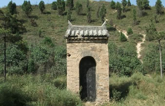 墓冢高大,狀如磨盤,上小下大,中間有一道環(huán)線,俗稱磨子陵。陵墓外形腰部有一環(huán)周兩層臺(tái)階,當(dāng)?shù)厝朔Q其為“磨子陵”,亦名“英陵”。