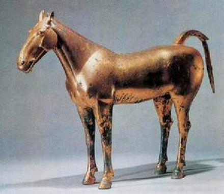 1981年5月在平陽(yáng)公主墓南,西吳鄉(xiāng)竇馬村農(nóng)民在平整土地時(shí)發(fā)現(xiàn)這件文物。高62厘米,長(zhǎng)76厘米,通體銅鑄鎏金,昂首,翹尾,四腿直立,體態(tài)矯健。頭部造型甚為生動(dòng),粉鼻亮眼,兩耳豎立。史書記載其為“金馬”,系以西漢時(shí)大宛國(guó)的汗血馬為原型而精制的工藝品。這件國(guó)寶,現(xiàn)收藏在茂陵博物館。