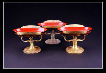 1981年5月茂陵一號(hào)無(wú)名冢南出土,整體分為座、杯上下兩部分,座為盤足,柿蒂狀支架,承托耳杯。酒杯平面呈橢圓形,圓形底,兩側(cè)附耳,紋飾華美,漆工與鎏金皆精湛,是研究西漢工藝美術(shù)史的珍貴實(shí)物資料。