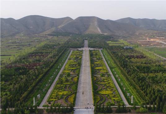 橋陵陵園略呈長方形,東西長2871米,南北長2836米,總面積852萬平方米。四面開辟有門,四角有樓。歷經(jīng)千年風(fēng)蝕雨剝,唐橋陵所保留的石華表、石鴕鳥、石馬、石人、石獨(dú)角獸、石獅等五十余尊巨大石刻依然形態(tài)清晰,生動(dòng)自然,其中的38尊排列在寬達(dá)110米、長625米的神道兩旁。