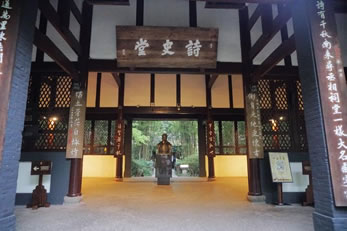 詩(shī)史堂是中軸線上的第三重建筑,也是主體建筑。杜甫留下的1400多首詩(shī)歌,真實(shí)而生動(dòng)地展現(xiàn)了“安史之亂”前后唐代社會(huì)生活畫卷,反映了唐朝由盛轉(zhuǎn)衰的歷史。杜甫被后世尊為“詩(shī)圣”,他的詩(shī)歌被稱為“詩(shī)史”, “詩(shī)史堂”也因此得名。大廳的正中陳列著一尊由我國(guó)著名雕塑家劉開渠先生以寫實(shí)的手法來(lái)刻畫的杜甫塑像。