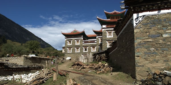 木雅人的房子中的一種形式與羌、嘉戎人的房子相似。“黑石為室”高數(shù)丈,一般三層,下層為養(yǎng)畜、中層住人、上層曬放柴草。住人的地方設(shè)有經(jīng)堂、茶房、臥室、涼臺(tái)、敞房和廁所。他們很少依山而居,一般房屋都筑在平地上。