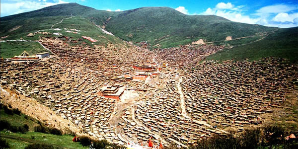色達(dá)佛學(xué)院 距色達(dá)縣城20余公里處,有一條山溝叫喇榮溝,順溝上行數(shù)里,就是舉世聞名的喇榮寺五明佛學(xué)院,也稱色達(dá)佛學(xué)院。色達(dá)佛學(xué)院是世界上最大的藏傳佛學(xué)院之一。