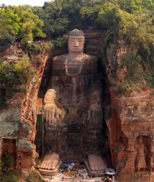 樂山大佛,又名凌云大佛,全稱為“嘉州凌云寺大彌勒石像”,位于四川省樂山市南岷江東岸凌云寺側(cè),瀕大渡河、青衣江和岷江三江匯流處。大佛為彌勒佛坐像,通高71米,是中國最大的一尊摩崖石刻造像。樂山大佛開鑿于唐代開元元年(713年),完成于貞元十九年(803年),歷時(shí)約九十年。