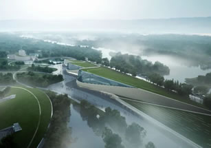 三星堆新館共三個(gè)堆體,東側(cè)兩個(gè)堆體為展陳空間,西側(cè)一個(gè)堆體為后勤庫區(qū)!毙吗^屋頂采用斜坡覆土形態(tài),建筑消隱融入環(huán)境,與一號館形體左右呼應(yīng);建筑形成三個(gè)沿中軸排列的覆土堆體,也寓意“堆列三星”。