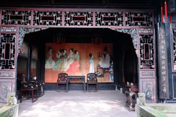工字廳的正前方有一臺(tái)階。臺(tái)階上方是戲臺(tái)。臺(tái)前立柱上有一副對(duì)聯(lián):“移影換形儼然君臣父子,假哭真笑表達(dá)離合悲歡”,構(gòu)思精妙,立意深刻,無聲地向人昭示:這里是戲劇的天地。臺(tái)口左右華板上雕刻著《白蛇傳》中的“船舟借傘”和《西廂記中》的“鶯鶯聽琴”。人物形神畢現(xiàn),栩栩如生。臺(tái)前的落地罩精致絕倫,有關(guān)專家學(xué)者稱贊其“集中國(guó)民間傳統(tǒng)木雕之精華”,自是當(dāng)之無愧,其雕刻內(nèi)容,有歷史故事,如“黃道州發(fā)兵抗清”;有戲劇故事,如“別窯從軍”;有的取材于唐詩(shī),如“尋隱者不遇”、“清明詩(shī)”等,有民間傳說,如“羊有跪乳之恩、烏有反哺之義”;有的采用諧音、象征手法表現(xiàn)美好的意愿的傳統(tǒng)圖案,如“掛印封候”、“富貴白頭”、“路路通順”等。
