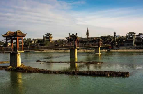 元通古鎮(zhèn)三面環(huán)水,一面環(huán)山。千百年來(lái),滾滾江水滋潤(rùn)著這方神圣的土地。江岸之外良田萬(wàn)頃,古鎮(zhèn)街頭院落森森。大小不一的街巷保存完好,木板房、青瓦房相連成片,遺存至今的古老民居,泱泱然散發(fā)著濃濃的古韻,挪動(dòng)著每一寸腳步,推開(kāi)每一扇窗欞,似乎都闖開(kāi)了歷史的大門自己也便,情不自禁、身不由己地也便走進(jìn)了過(guò)去,走進(jìn)了歷史。走進(jìn)元通深處,一幢幢民房,一條條街巷,摸著這歷史的邊邊角角,終于找到了心靈的歸宿。元通古鎮(zhèn)依山傍水一路修來(lái),鎮(zhèn)上的主要建筑都沿文井江拔地而起,上千戶人家臨河而居,水是他們的寄托,水是他們的立命之本,水與這里的人結(jié)下了不解之緣。所以,生活在這里的居民,家家的后院里都有石階可以下到河邊。古時(shí),鎮(zhèn)上的人出行大都靠水遠(yuǎn),家家戶戶都順著后門的石階進(jìn)進(jìn)出出,那情形有如走進(jìn)了以一處江南水鄉(xiāng)。在江河之上,一道鐵橋?qū)⒐沛?zhèn)與外灘緊緊地連在一起,時(shí)疏時(shí)密的鄉(xiāng)民在橋上來(lái)來(lái)去去,如履平地。這座橋名叫匯江橋,全長(zhǎng)164米、寬2、5米、高6米,造型古雅,除兩端橋樓,中間幾座帶歇山項(xiàng)的涼亭在寬闊的江面上頗顯風(fēng)致,橋下是文錦江,味江和泊河江在元通的匯流之處,流床寬闊,水流湍急,極為有利于水上航運(yùn)。據(jù)方志載,古運(yùn)通航,元通堪以重任,從此起航,須經(jīng)白馬渡,陳家渡、方渡,再順著崇州境內(nèi)最大最長(zhǎng)的河流――西河到新津龍王渡,然后進(jìn)入岷江,這段30余公里的航道乃為崇山十分重要水上交通。正是通過(guò)這條航道,元通境內(nèi)的土特產(chǎn),才得以遠(yuǎn)銷樂(lè)山、宜賓、瀘州等地,同時(shí)他們也從這條道上獲得了生活中的日用百貨,因元通是物流的集散地。同時(shí),外地客商也多聚匯于此,于是元通市井繁榮,生意興隆,到清咸豐年間終成大鎮(zhèn)。匯江橋雖造型古雅,但是一座現(xiàn)代橋,其修建年代竟為1986年,據(jù)載,最早的鐵索橋建于清光緒年間,長(zhǎng)達(dá)130余米,氣勢(shì)宏大壯觀,因晚清末年清明會(huì)時(shí)人多坍塌,其后人元通人又募資再建,造型如同今日,可惜毀于“文革”風(fēng)暴,視橋?yàn)榍楦屑耐械脑ㄈ,出于?duì)歷史的情感顧念,再次集資修建了索橋。
