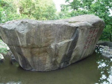 在東西浮青嶺之間山谷中,兩邊是險(xiǎn)峻的陡壁,清秀的峰巒,澗谷中彎曲的小溪,清流湍急。當(dāng)?shù)罊M臥一石,長數(shù)丈,高丈余,上寬下窄,形同元寶,名元寶石,上鐫“此地有崇山峻嶺,怪石奇松。古檀寧椿,“古檀”是密云。寧椿是名字。古密云縣的一位舉人經(jīng)過這里,被盤山的美景吸引住了,他想用一句話來概括盤山的勝景,于是他便借用了晉代著名書法家王羲之的《蘭亭序》中有“此地有崇山峻嶺,茂林修竹”一句,他看到盤山松樹長勢(shì)奇特,巖石形狀怪異。因而在這里留下了“此地有崇山峻嶺,怪石奇松”。