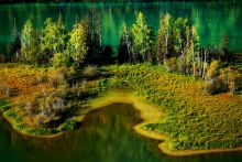 變色湖位于喀納斯湖中央。春夏時節(jié),湖水會隨著季節(jié)和天氣的變化而變換顏色。從每年的四五月間開化到11月冰雪封湖,湖水在不同的季節(jié)呈現(xiàn)出不同的色彩。5月的湖水,冰雪消融,湖水幽暗,呈青灰色;到了6月,湖水隨周山的植物泛綠,呈淺綠或碧藍色;7月以后為洪水期,上游白湖的白色湖水大量補給,由碧綠色變成微帶藍綠的乳白色;到了8月湖水受降雨的影響,呈現(xiàn)出墨綠色;進入9、10月,湖水的補給明顯減少,周圍的植物色彩斑斕,一池翡翠色的湖水光彩奪目。