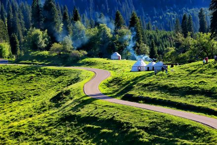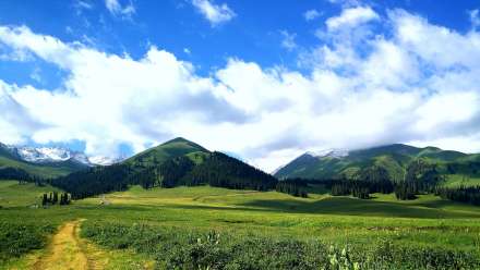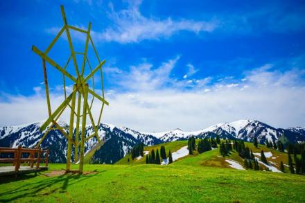 哈薩克語為“美麗的山溝”,是進入河谷草原的第一站,擁有一山四景,白雪皚皚的山峰、茂密的森林、連綿起伏的山丘、平坦的草甸,是草原垂直自然景觀帶的窗口。其東側(cè)的山坡形似天山母親的耳朵,聆聽著大地的聲音,默默守護著天山,被稱之為“天山之耳”。西南側(cè)的山坡形似一匹昂首奔騰的駿馬,見者“馬到成功,飛黃騰達”被取名為“飛馬坪”。