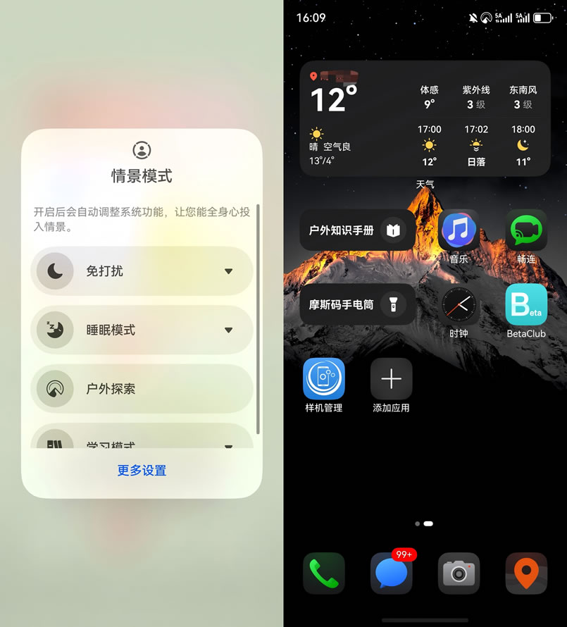 除此之外,我還留意到一個很貼心的設計:開啟戶外探索模式后,桌面上的天氣時鐘組件會自動切換成“戶外版”——字體變得粗大清晰。在戶外徒步中,只需瞥一眼屏幕,快速知曉時間、氣溫等。