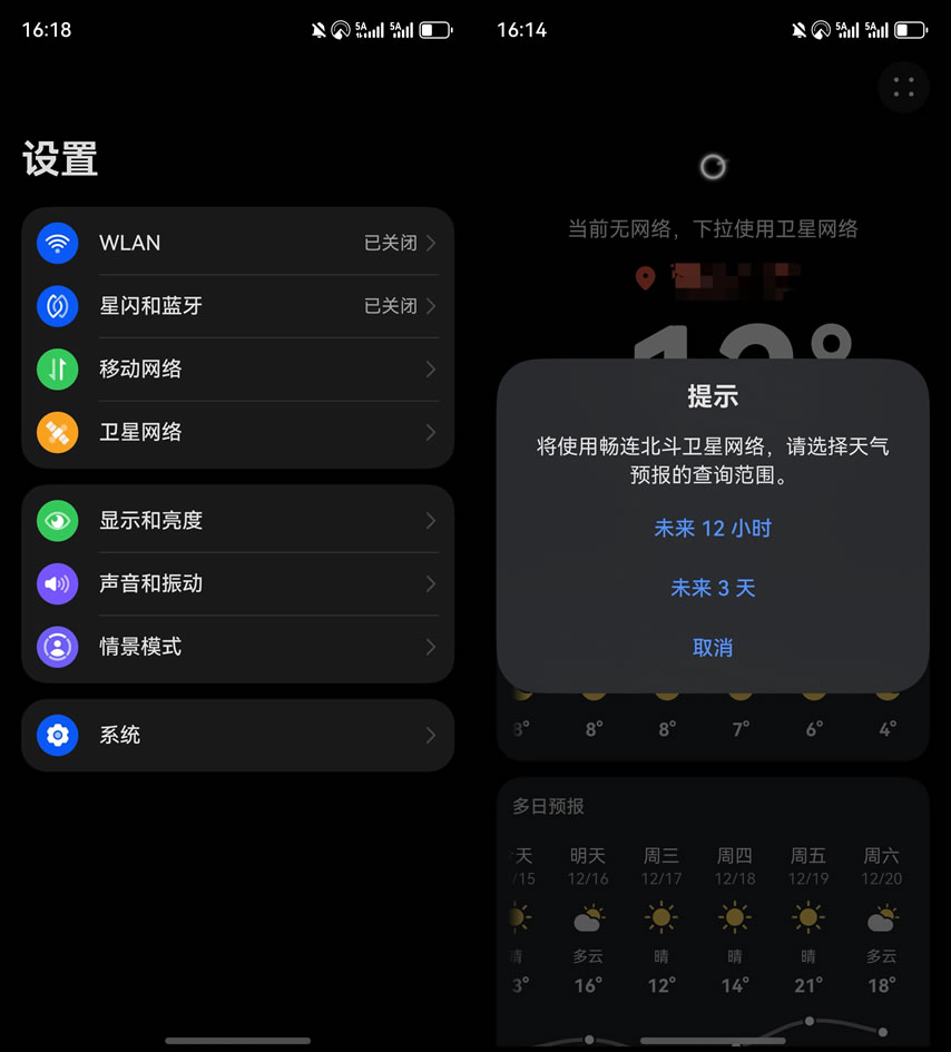 哪怕營地完全沒有信號,現(xiàn)在也不用慌。有網絡時提前在設置-衛(wèi)星網絡里打開“暢連北斗衛(wèi)星消息”后,我可以切換到衛(wèi)星網絡模式,能查看未來12小時、最長3天的天氣數(shù)據(jù)。手里有這個戶外神器,再也不必擔心與世隔絕和天氣突變了。