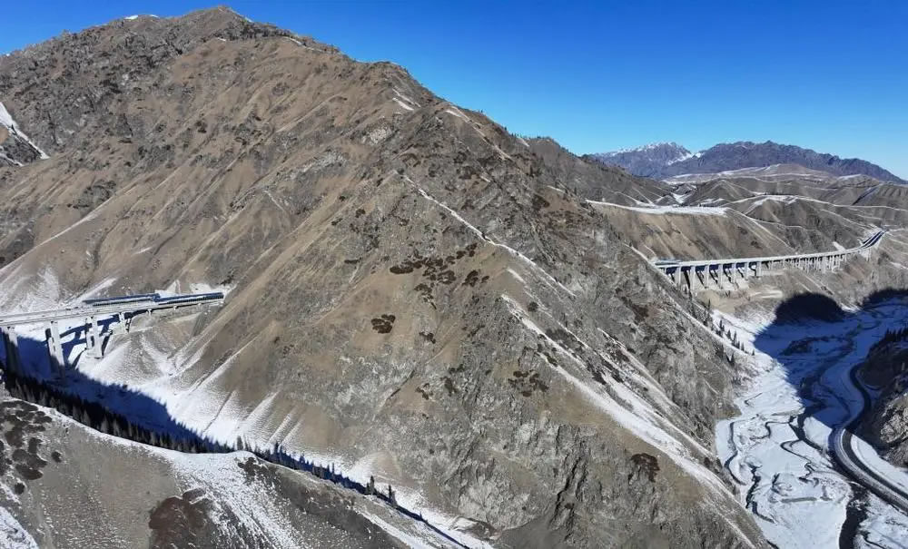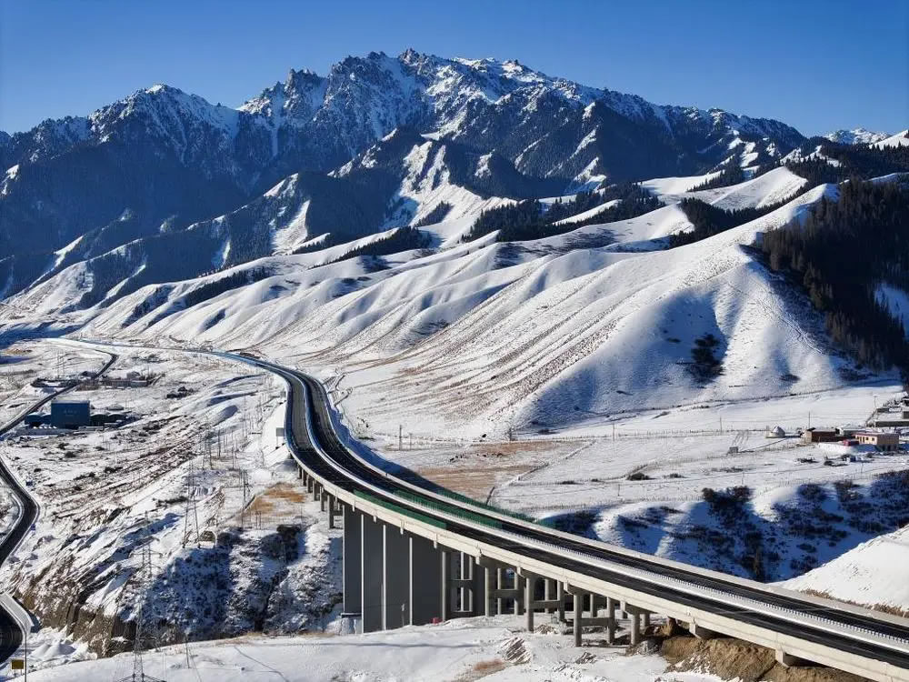 12月下旬,記者驅車從烏魯木齊前往烏尉高速采訪。寒風掠過天山山脊,皚皚白雪覆蓋著險峻山群,層巒疊嶂之中,一條大道向前鋪展,于天山內部打通條條隧道,在崇山峻嶺間架設橋梁。