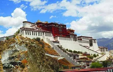 布達(dá)拉宮,石木交錯(cuò)的建筑方式,宮殿本身所蘊(yùn)藏的文化內(nèi)涵,以及由經(jīng)幢、寶瓶、摩羯魚(yú)、金翅鳥(niǎo)做脊飾的點(diǎn)綴,使整座宮殿顯得富麗堂皇。大殿內(nèi)的壁畫(huà)亦算是布達(dá)拉宮內(nèi)一道別致風(fēng)景,在這堪稱(chēng)巨型繪畫(huà)藝術(shù)長(zhǎng)廊內(nèi),既記載有西藏佛教發(fā)展歷史,又有五世達(dá)賴(lài)生平,文成公主進(jìn)藏過(guò)程。
