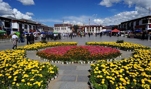 大昭寺已有1300多年的歷史,在藏傳佛教中擁有至高無上的地位。大昭寺是西藏現(xiàn)存最輝煌的吐蕃時期的建筑,也是西藏最早的土木結(jié)構(gòu)建筑,并且開創(chuàng)了藏式平川式的寺廟市局規(guī)式。環(huán)大昭寺內(nèi)中心的釋迦牟尼佛殿一圈稱為“囊廓”,環(huán)大昭寺外墻一圈稱為“八廓”,大昭寺外輻射出的街道叫“八廓街”即八角街。以大昭寺為中心,將布達(dá)拉宮、藥王山、小昭寺包括進(jìn)來的一大圈稱為“林廓”。這從內(nèi)到外的三個環(huán)型,便是藏民們行轉(zhuǎn)經(jīng)儀式的路線。