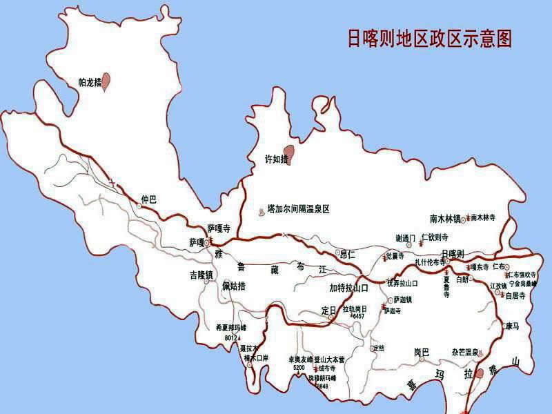 薩迦縣 面積8126平方千米,人口48766,政府駐薩迦鎮(zhèn),下轄2個鎮(zhèn)、9個鄉(xiāng)