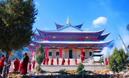 普濟(jì)寺位于麗江古城西北6千米的普濟(jì)山中,始建于清乾隆三十六年(1771年),為麗江城郊五大喇嘛寺之一,因大殿鋪蓋銅瓦面而聞名遐邇。大殿院落由山門、護(hù)法堂(門樓)、正殿、南北廂房組成四合院。正殿平面是長(zhǎng)方形,初用土瓦覆蓋,由圣露活佛輾轉(zhuǎn)西南各地講經(jīng)、集資,于1936年改覆銅瓦,面積為46.4平方米。