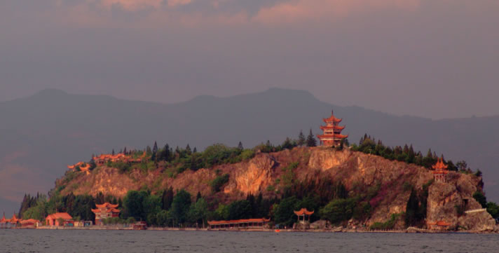 孤山,原名瀛海山,位于距江川城區(qū)約17公里的撫仙湖江川水域之中。明代以前瀛海山傍有一小島,兩島之間有一鐵橋相通。明末一夕地震,小島及虹飲橋沉沒,唯瀛海山屹然獨(dú)存,孤山由此得名。孤山成于宋,盛于明,曾建有八殿五閣三亭一堂一庵一塔。