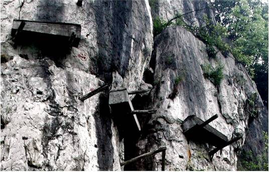 瓦石僰人懸棺位于威信縣長安鄉(xiāng)瓦石行政村棺木崖和白虎巖上,與四川省珙縣僰人懸棺相同。棺前為林鳳河瓦石段。由于大量朽壞脫落,現(xiàn)懸棺3具,復(fù)制4具后計7具,民間傳說為何姓“白人子”墓。明代以前遺物,石上鑿孔,插入厚木,棺凌空橫置木上,任憑風(fēng)吹雨打。 掛于數(shù)百米懸崖絕壁上,是神秘和求知的象征。懸棺雖然經(jīng)過部分整理,但原貌基本尚存。2000年,已由奧地利王妃出資進(jìn)行保護(hù)。從山下仰望萬仞絕壁上的懸棺,給人的絕非是神秘和震撼的感覺。