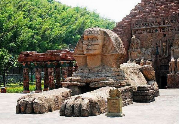 漫漫黃沙中,那宏偉的建筑,依稀就是魂?duì)繅?mèng)繞已久的胡夫大金字塔和守護(hù)它數(shù)千年的獅身人面像;燥熱暖風(fēng)里,法老們古老的咒語(yǔ),斷斷續(xù)續(xù)飄來(lái),召喚著我們不由自主的向前,渴望一探究竟。坐上埃及的太陽(yáng)船,穿過(guò)金字塔黑暗的甬道,危險(xiǎn)的鬼屋,劈波斬浪的剎那,才發(fā)現(xiàn)早已沉醉在古埃及異度時(shí)空的迷夢(mèng)中。