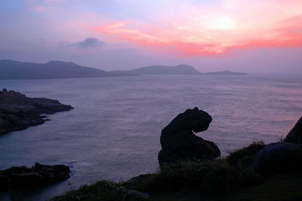 慈航普渡的觀世音菩薩在南麂列島定格、凝固成了高20米的天然巨像,它身披風帔(俗稱“觀音兜”),垂著兩袖,眉目宛然,專注地向東海第面凝視。然而這觀音巖腳下全是刀劍般的礁石,潮來時淹滿水,更像是泥犁地獄了。而在不遠的1.5米外,有5支石柱聳立,其中最高的柱頂,酷似調皮搗亂和小猴子。它在觀音菩薩面前,有所窺伺,又有所祈求。更令人驚奇的是,景隨步移,若南行數十步,從另一個角度望,慈目的妙齡觀音卻突然變成了老態(tài)龍鐘的南極仙翁,故人們又稱之“壽星巖”。移步換形不僅平尜游人興趣,而且從“雙面人”身上也不有同感悟。
