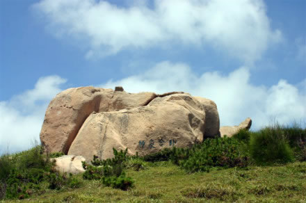 能以人力或風力推動而搖擺的大巖石,在各地勻有發(fā)現。南麂三盤尾石門旁的風動巖卻別有情趣。此石高約5.5米,直徑4米,形如銅鼓,卻裂成兩瓣,一瓣是“靜如處子”分外端莊;另一瓣,凡遇上5級以上大風,便自行搖動,可謂“動似脫兔”,還以發(fā)出悅耳聲響,宛如海底傳來的進軍號角。倘若無風時,那只得勞駕游客,憑力氣去推、去搖。面對風動巖了,聯想起佛教中關于“風動也,情動也,見仁者自己心動”的“因緣和合”典故,似乎明白了自然景觀中也充滿生活哲理。此巖其自身根基不穩(wěn),加上風的外力,便顯得搖擺不定。